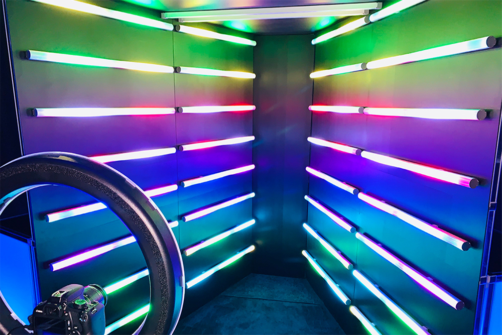 The Black Light Booth is an enclosed photo booth that surrounds your guests with reflections that go on forever. Guests wear black light props and can even write on the walls with special black light markers, making for a huge signing board! Guests interact with a super easy to use touchscreen inside. Choose from animations or photos for your event. Guests receive their images through text and email, ready to be shared on social.